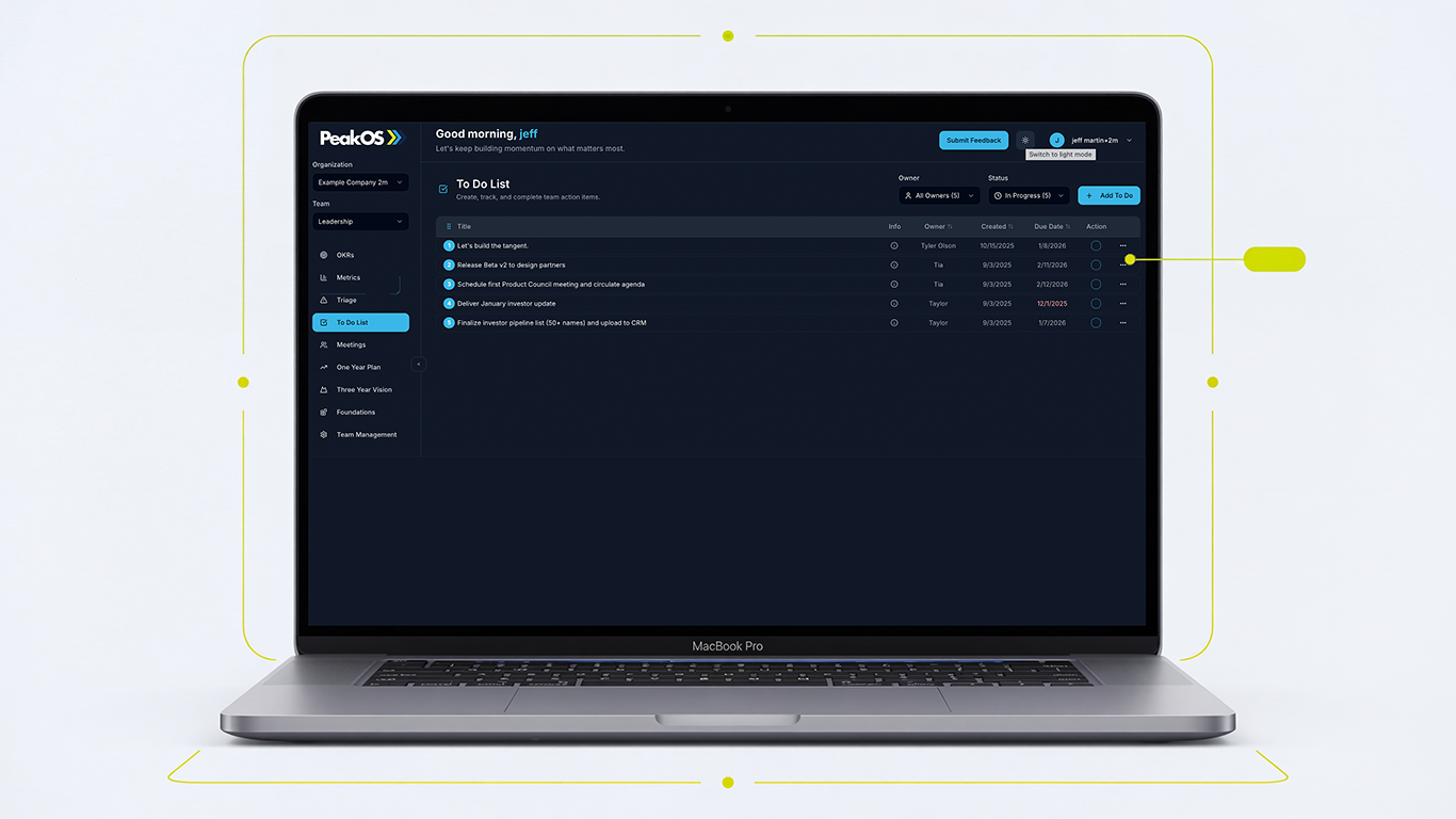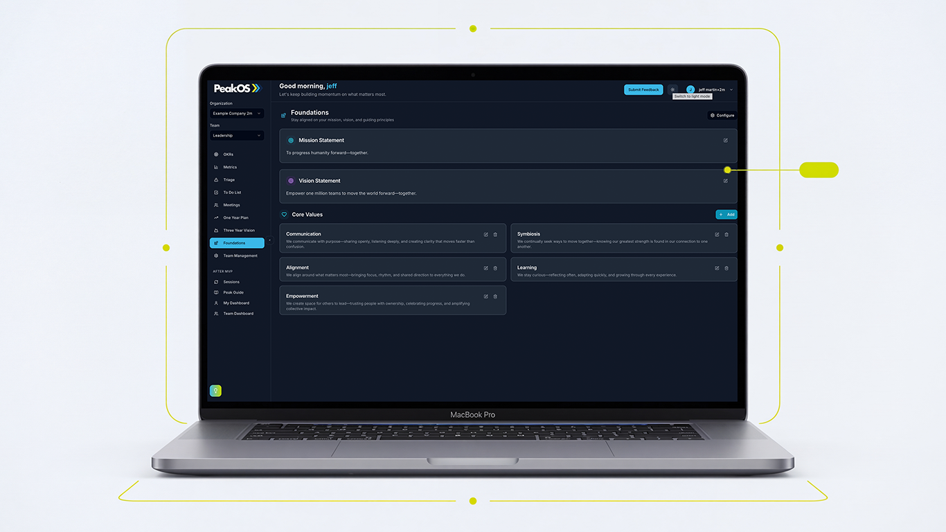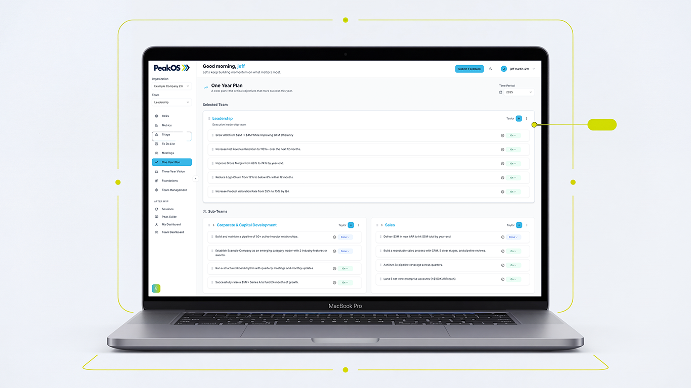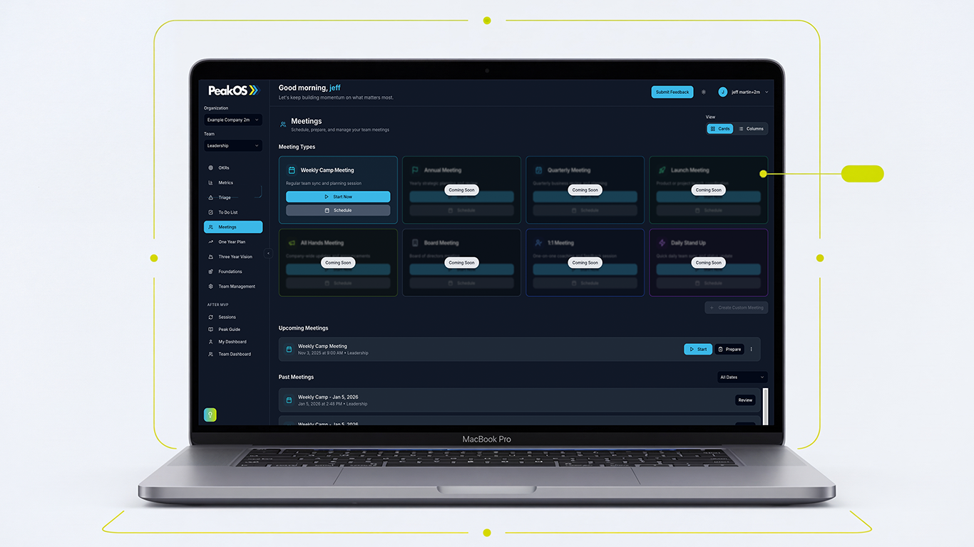 Rather than forcing a framework into generic software, Peak OS embeds the methodology itself and uses AI to help teams stay aligned, focused, and executing at speed. The result is an intuitive operating system that connects planning, execution, and cadence into one clear rhythm.